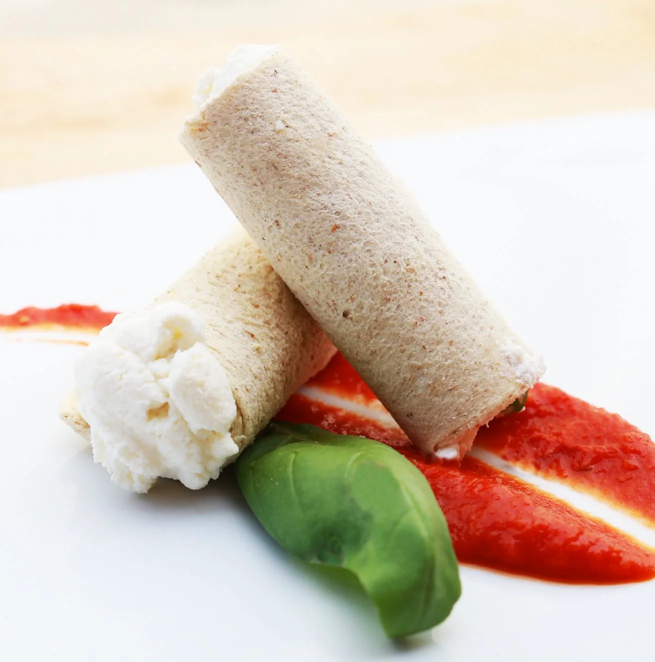 In a bowl add the ricotta, Parmesan, basil and salt. Use a tablespoon to create a well blended and compact mixture. Roll out the bread with a rolling pin to make it easier to roll and with make the Cannelloni with the aid of an aluminium tube (Fig. 3). Cook in the oven for 5 minutes at 350°. Once removed from the oven, garnish with the ricotta mixture and serve.