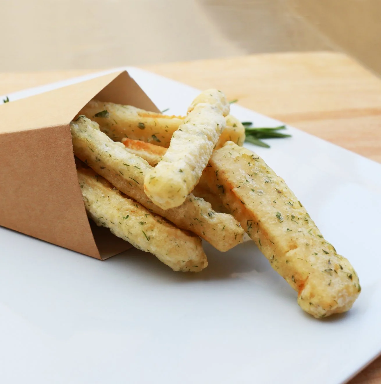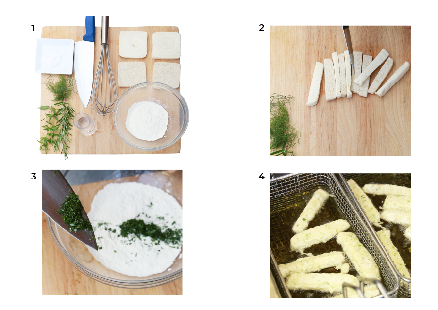 Cut the Crust Away into strips (Fig. 2), prepare the mixture for the batter with water, flour and herbs. Blend it all together and dip the bread strips into the mixture. Fry until the preferred shade of brown is reached.